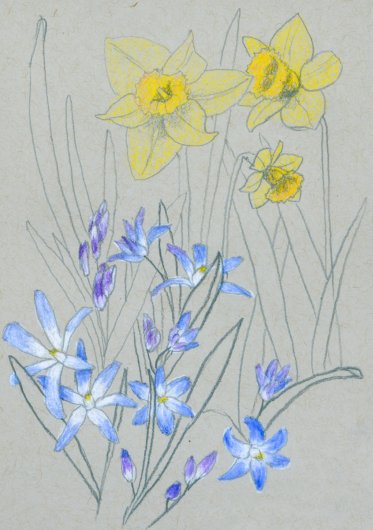 Drawing completed of snow glories and daffodil flowers in my Oregon backyard.